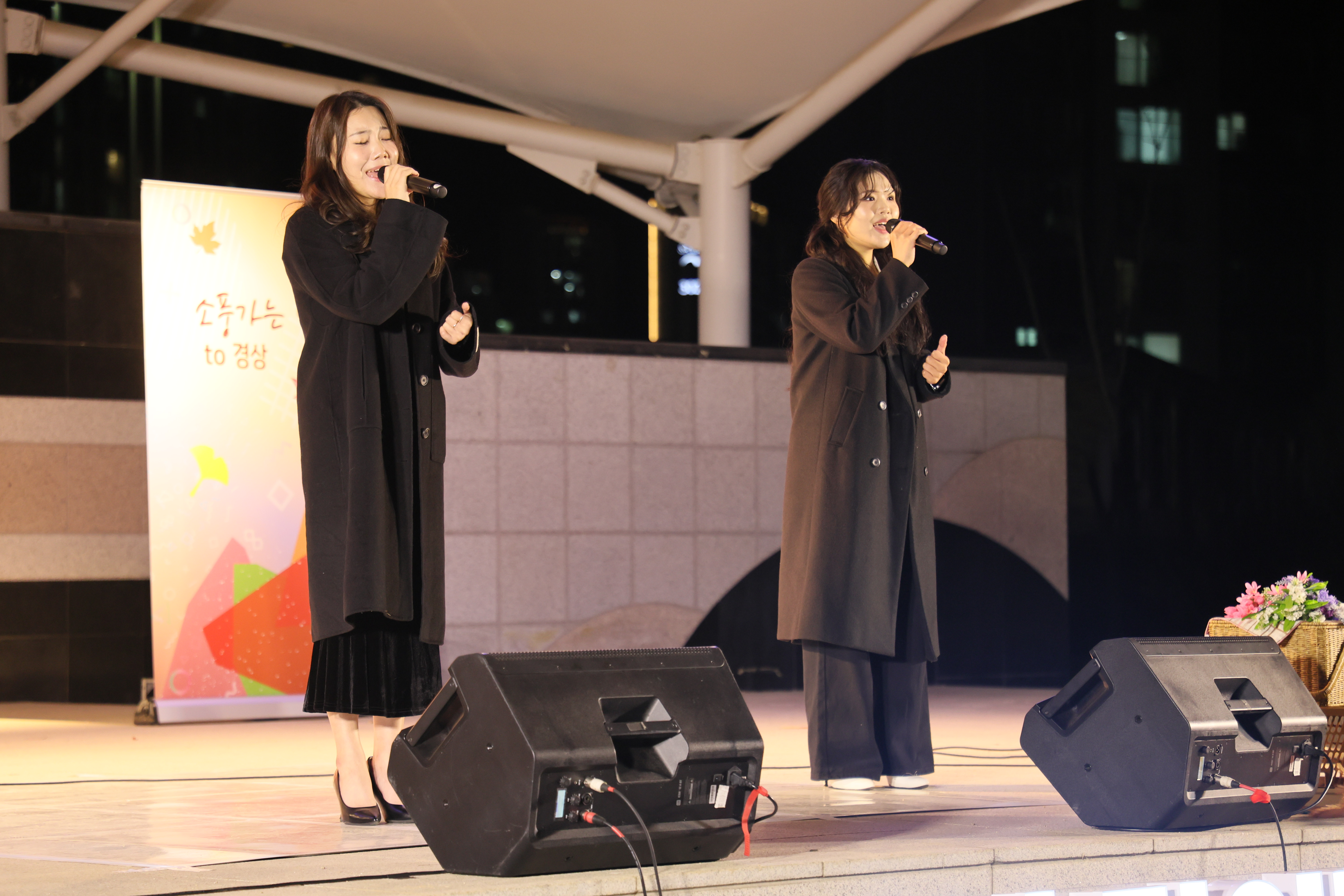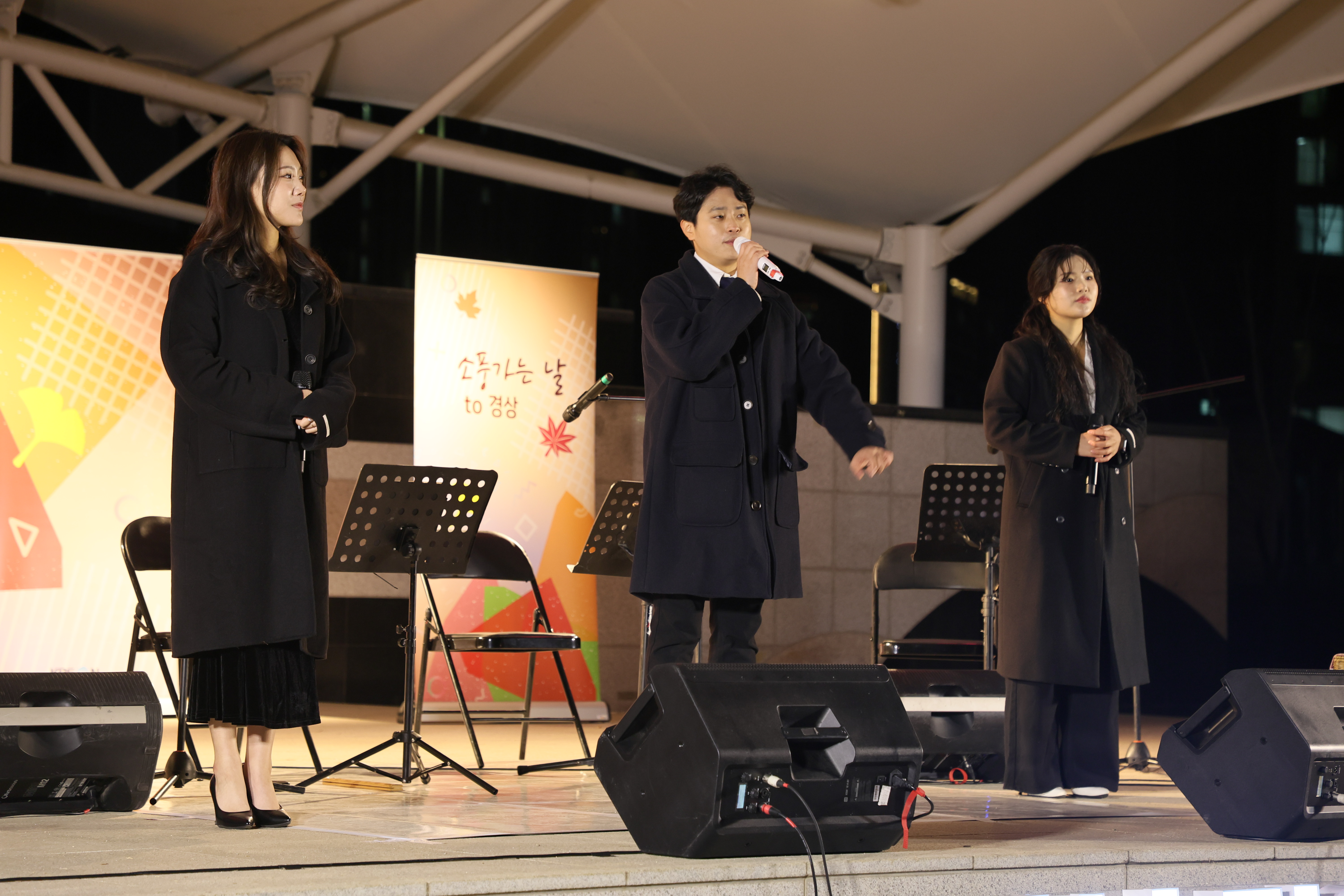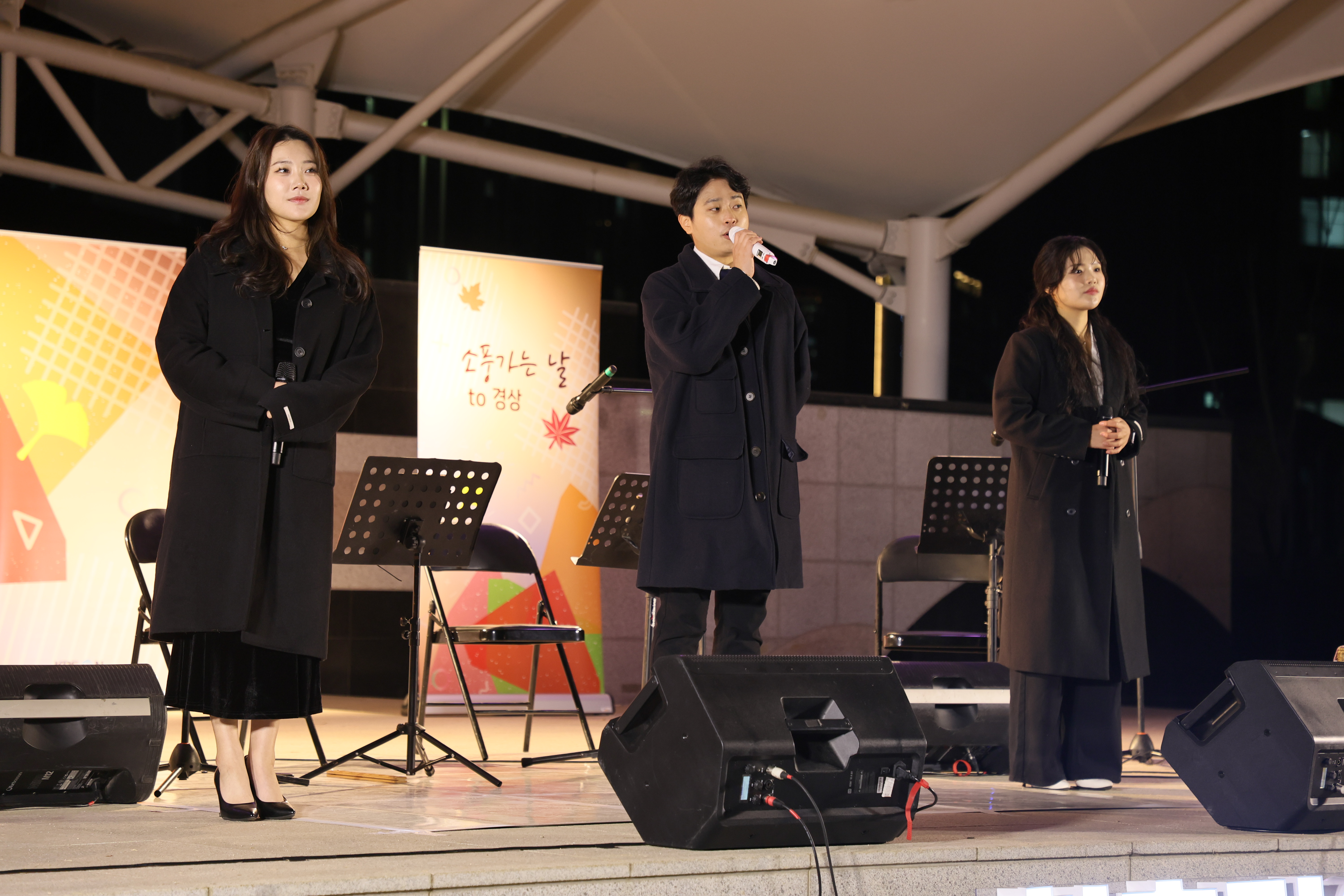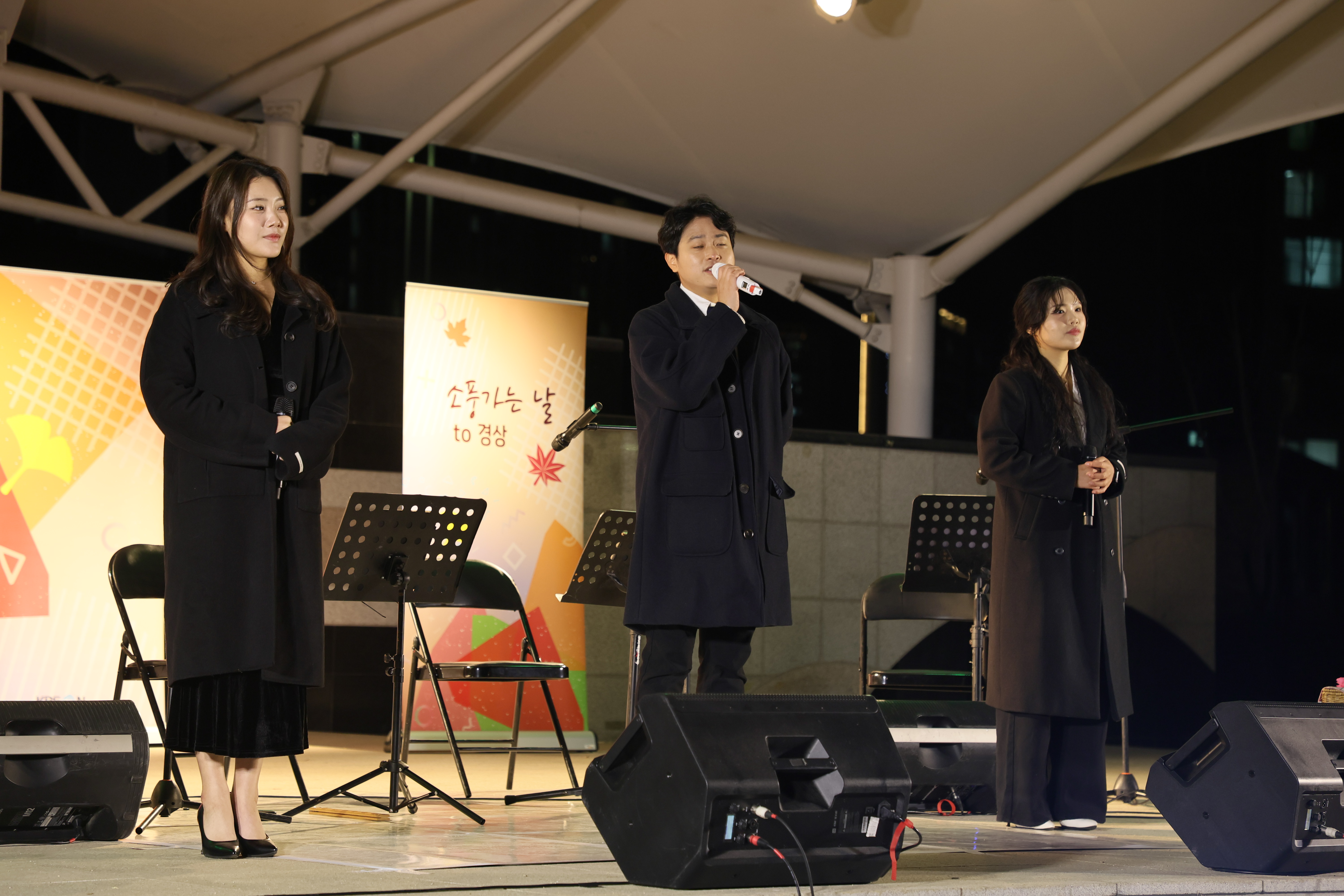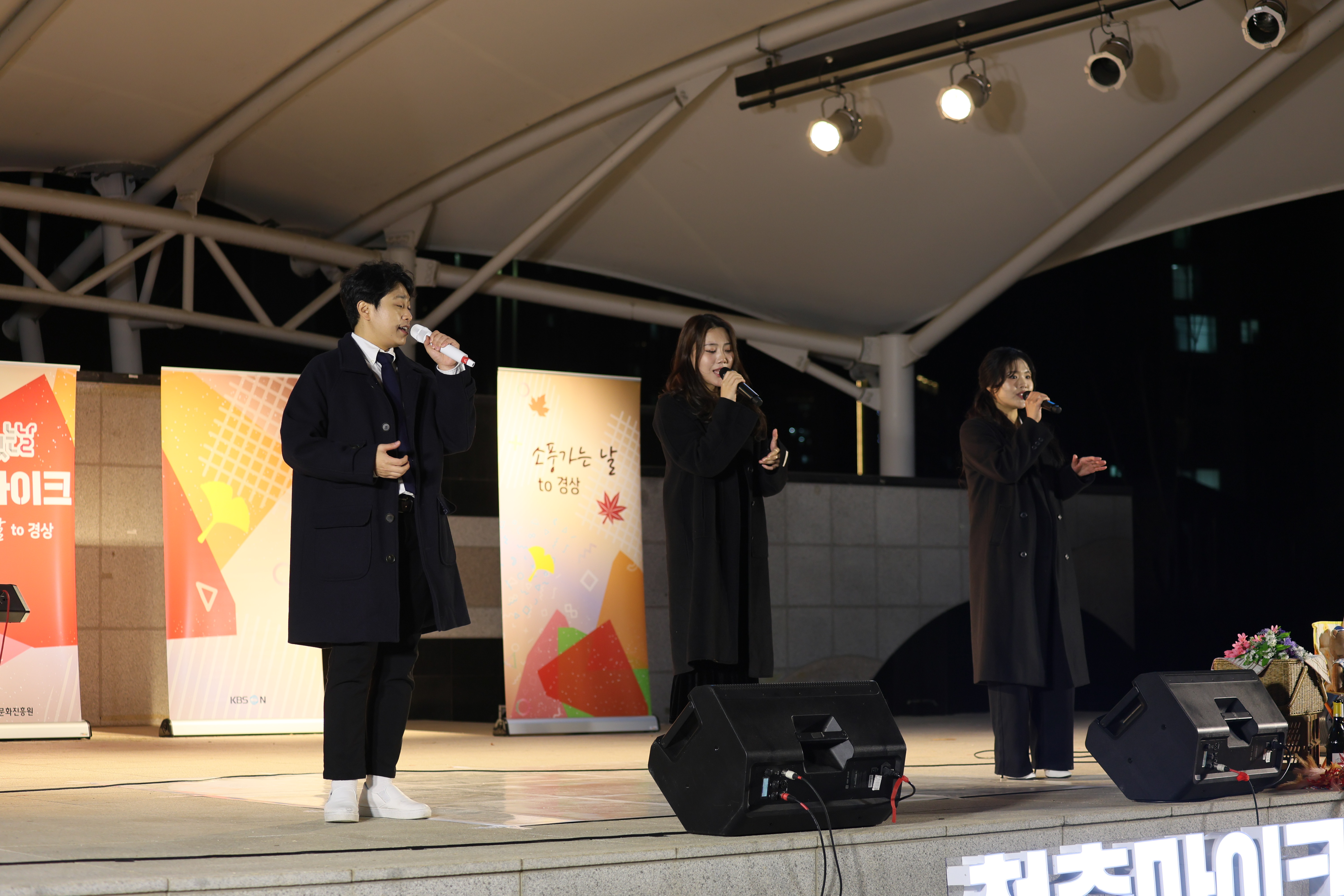 셋이서 서서 노래 불렀습니다.
