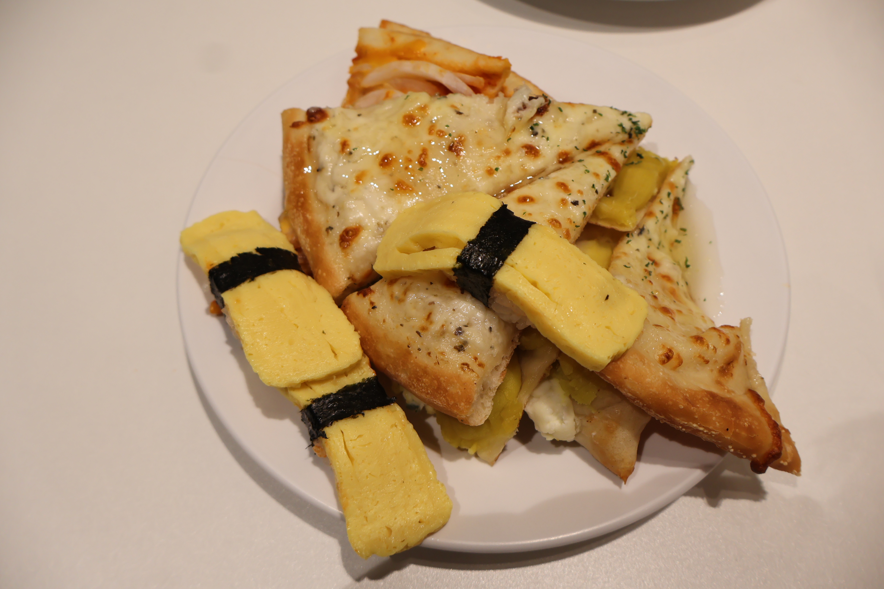 계란초밥과 피자 3종 입니다.