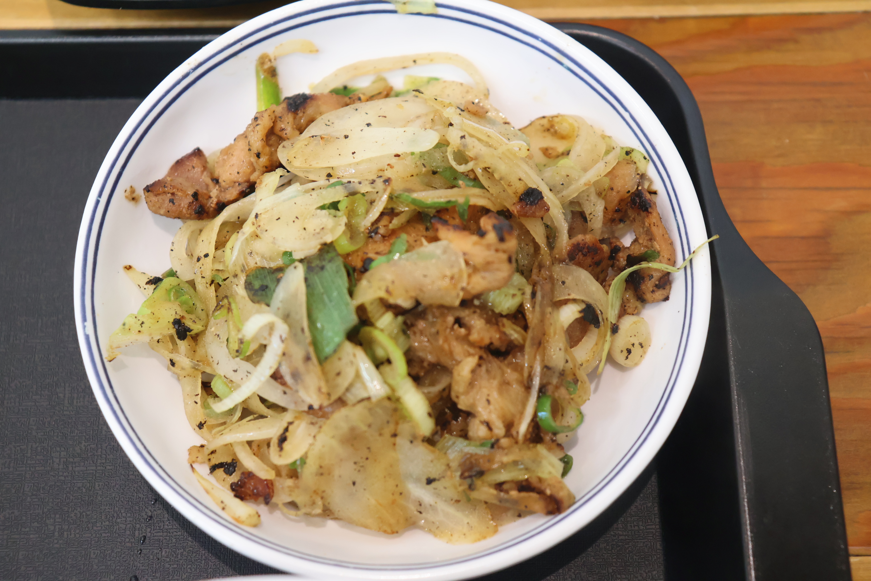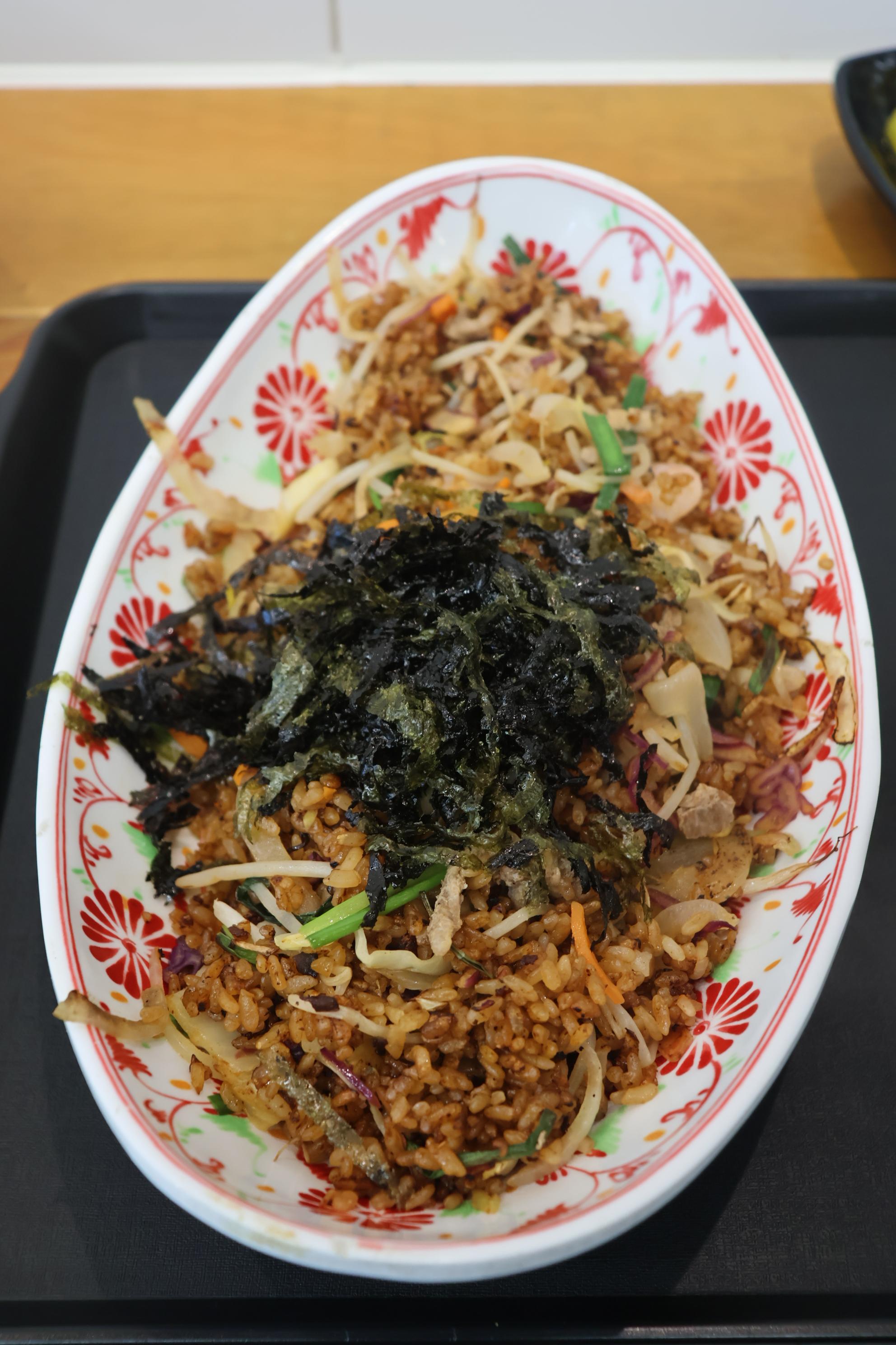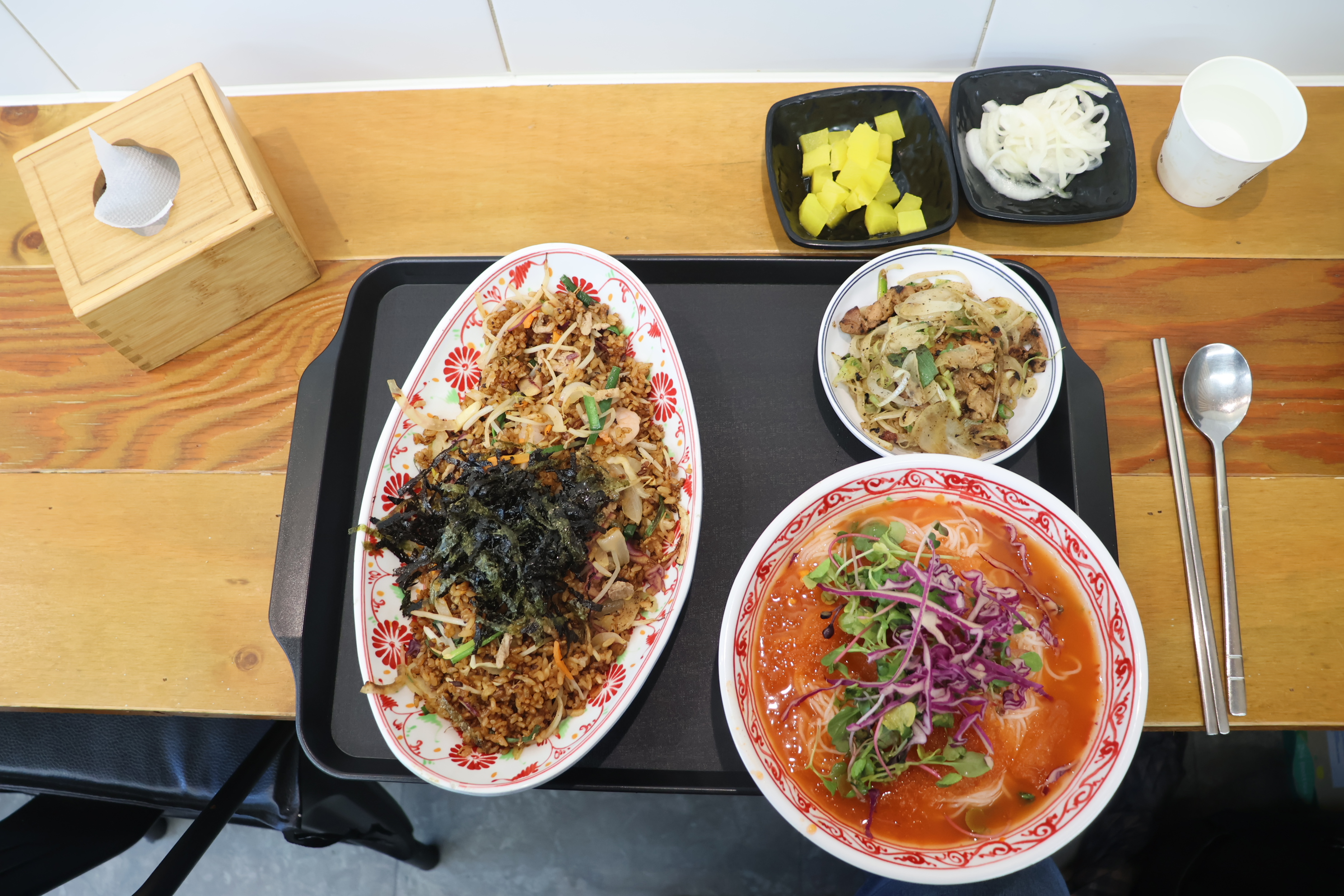 볶음밥과 냉쌀국수, 숯불고기와 양파, 단무지 입니다.