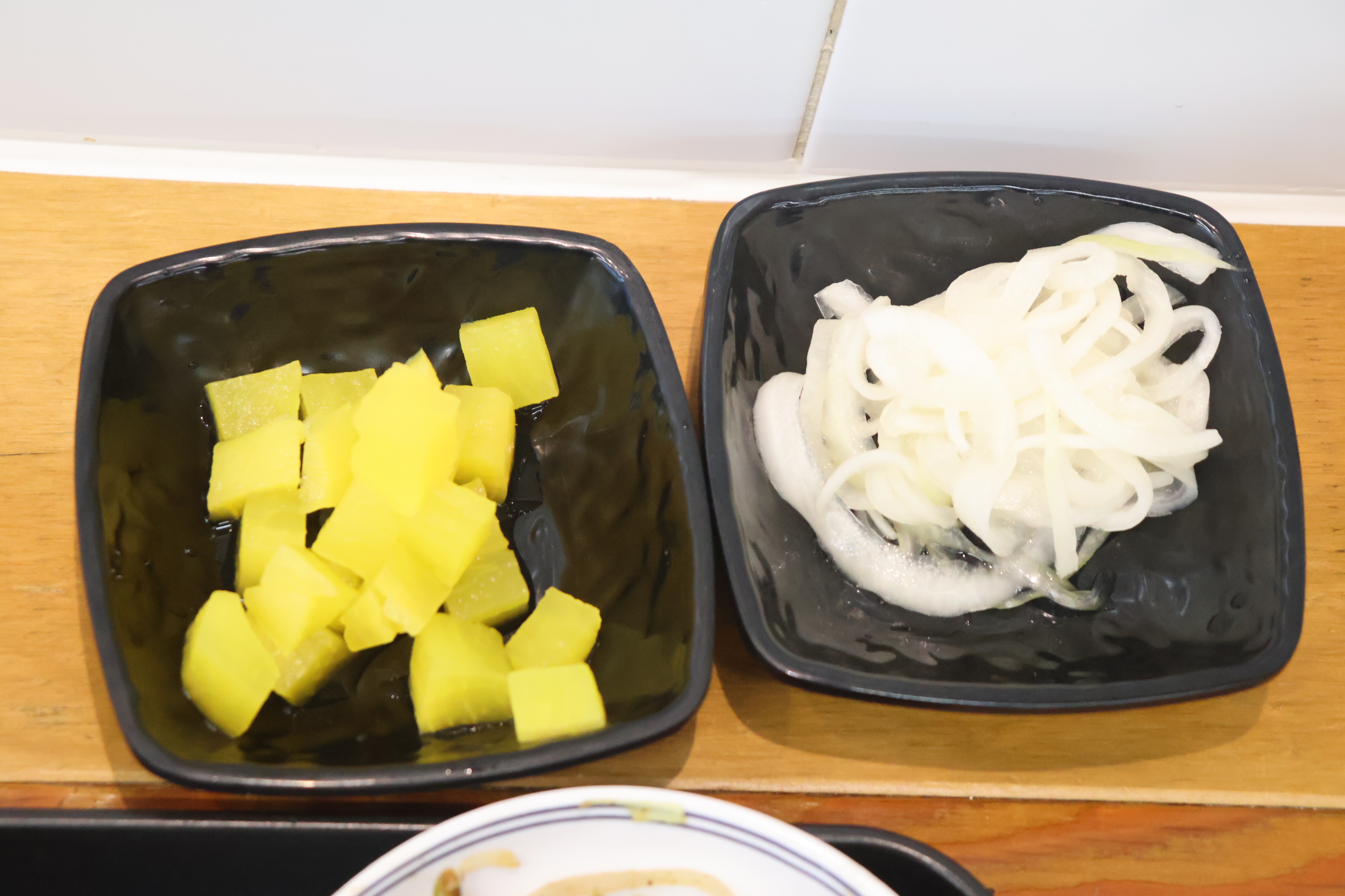 절임양파와 깍두기형 단무지 입니다.