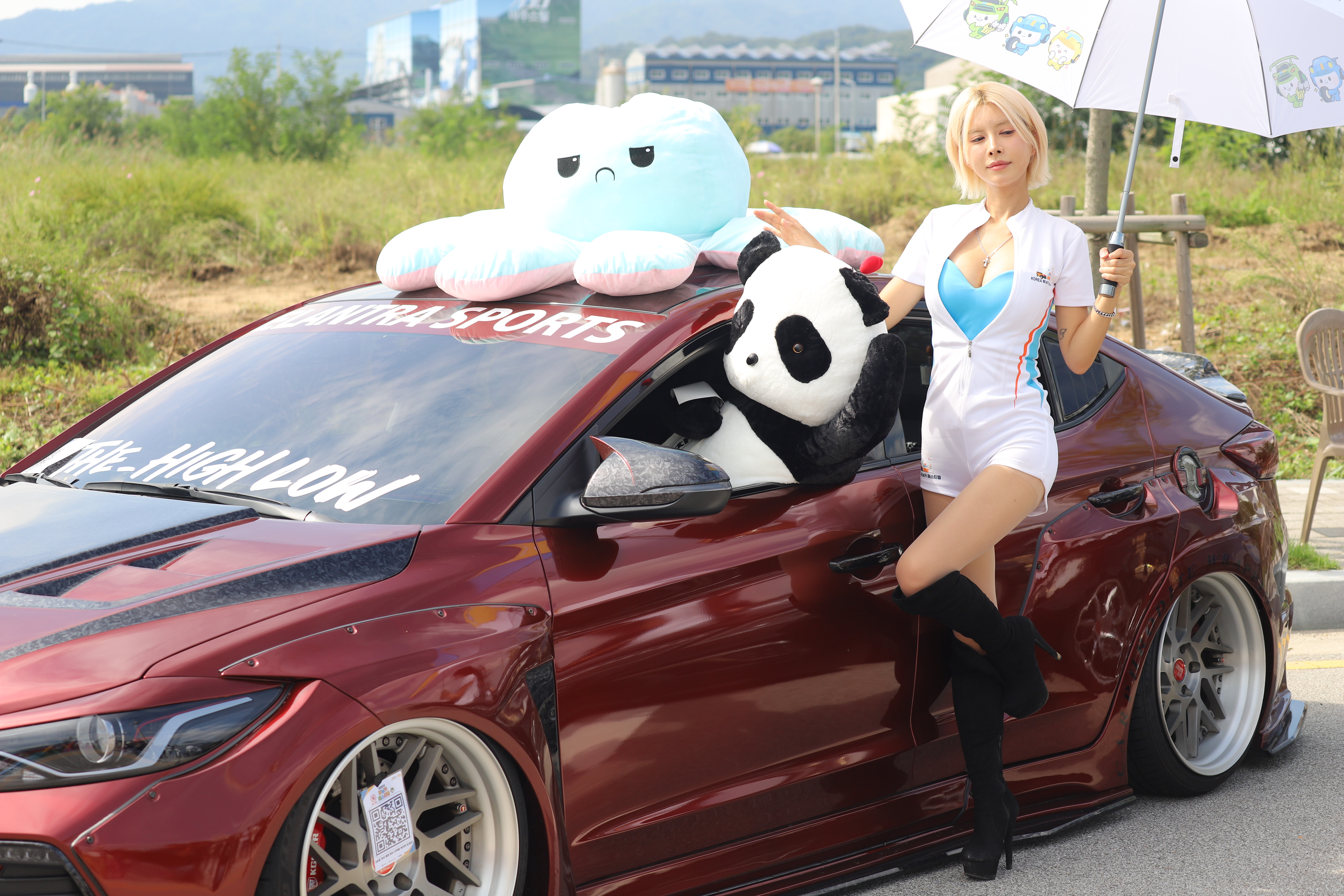 빨간색 아반떼 튜닝카에 인형을 들고 있는 모습 입니다.