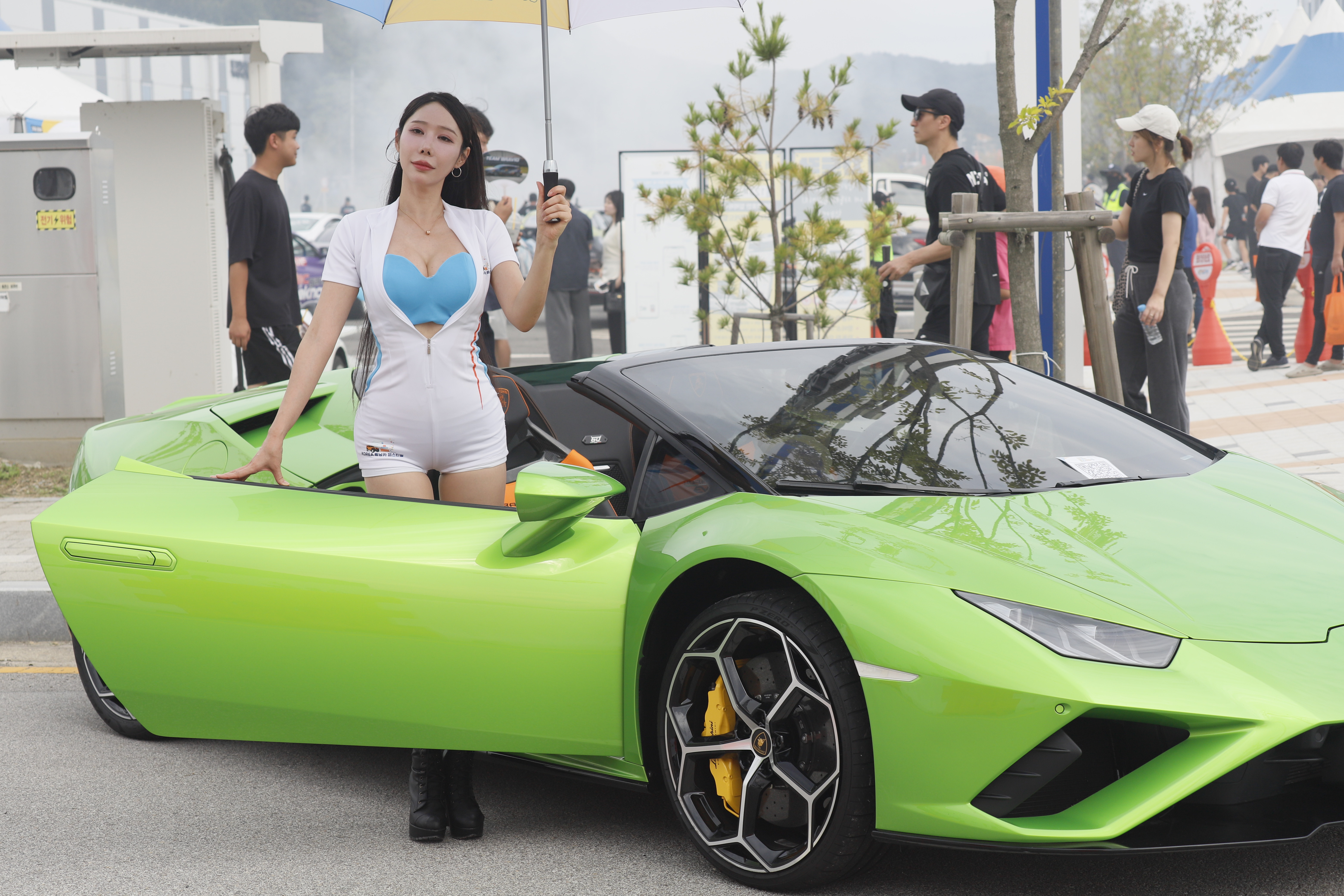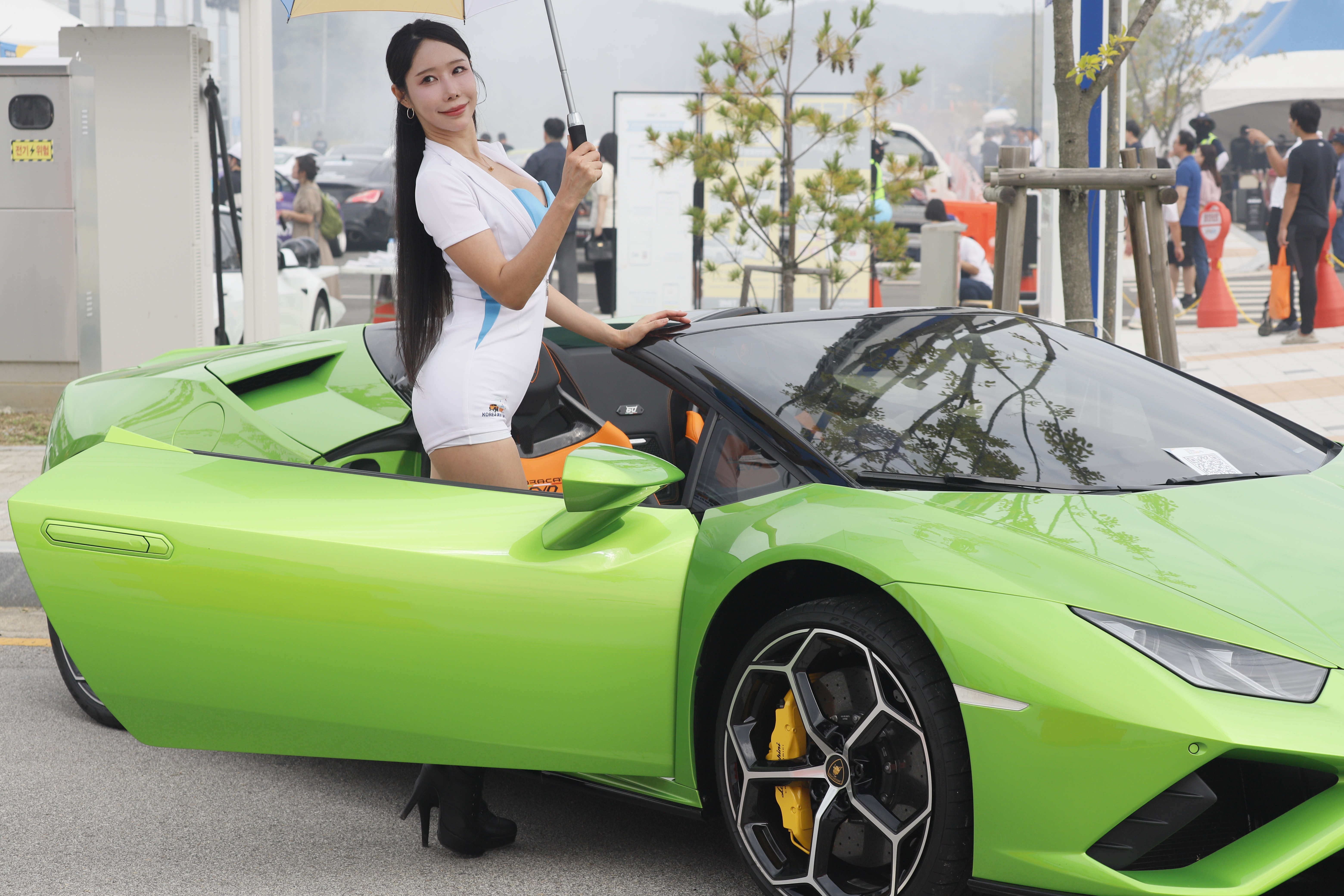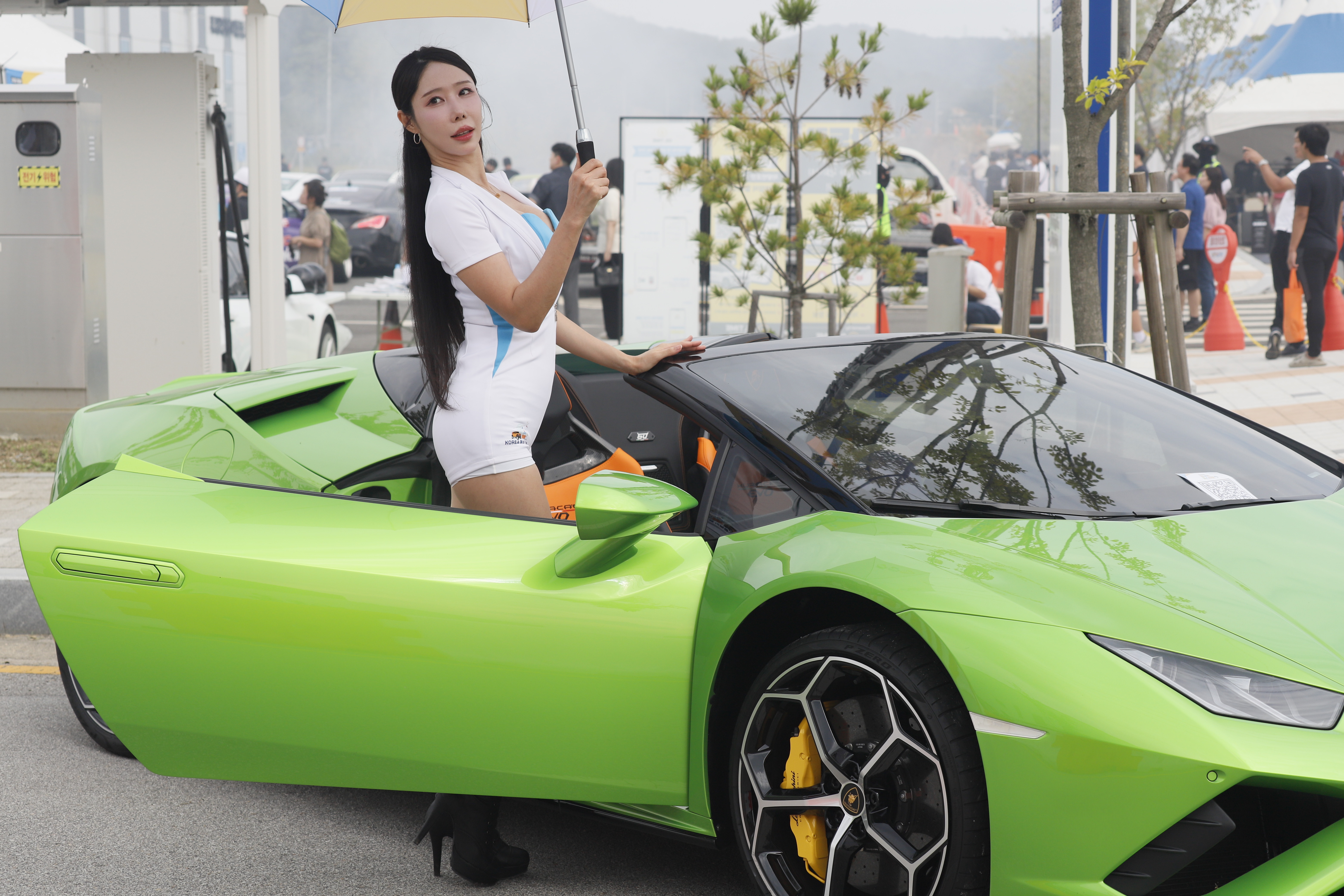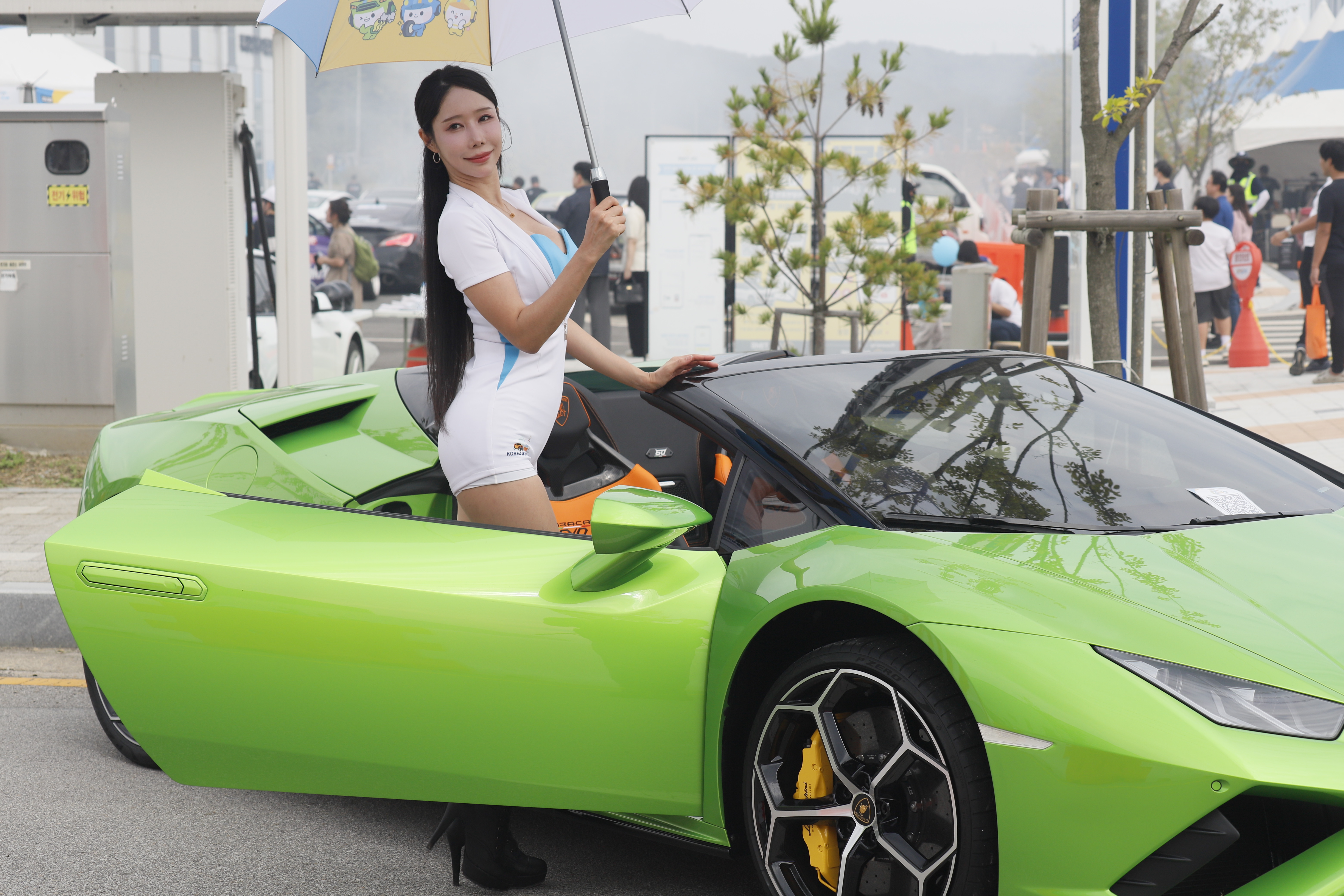 연두색 튜닝카 문을 연 상태에서 포즈 취합니다.