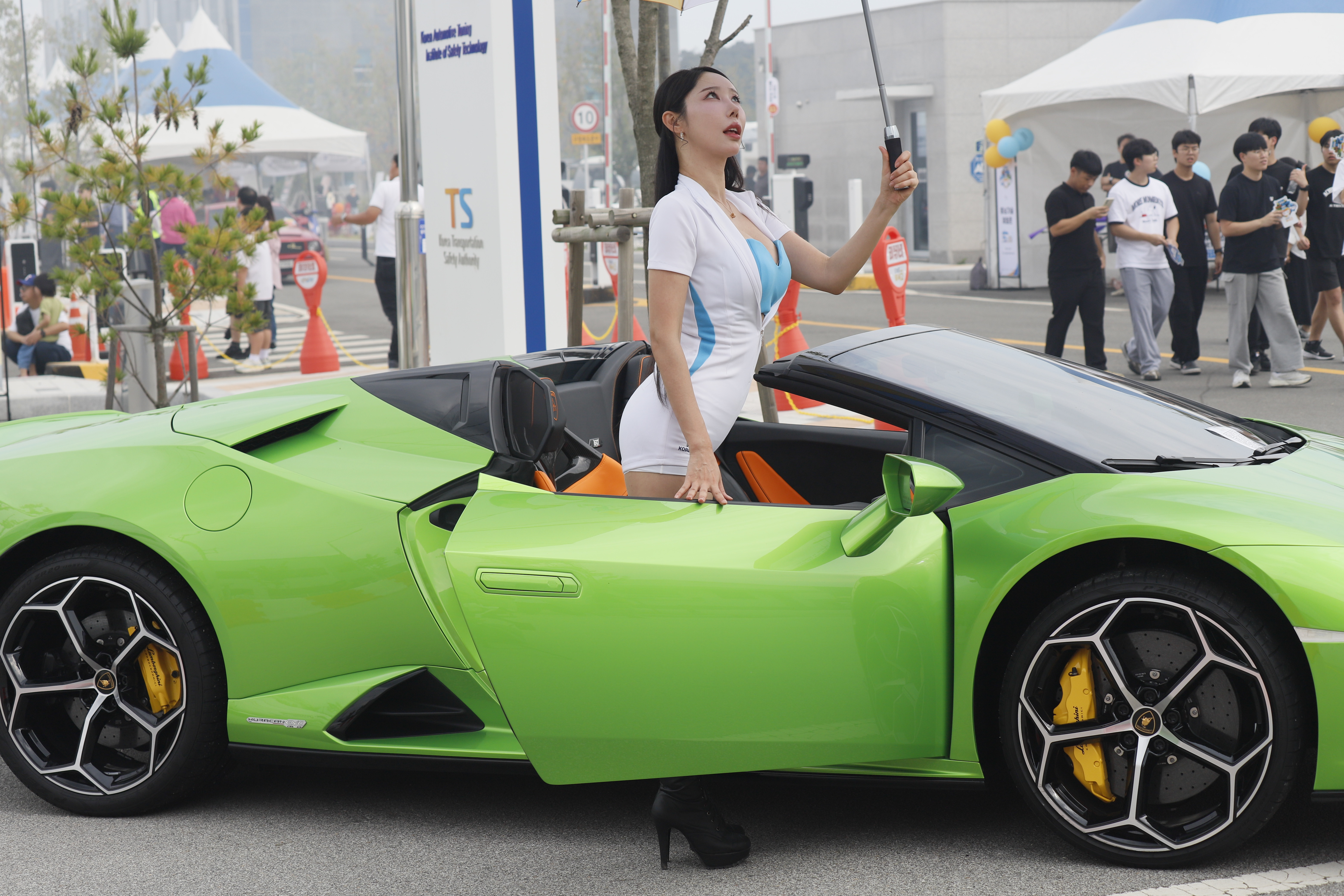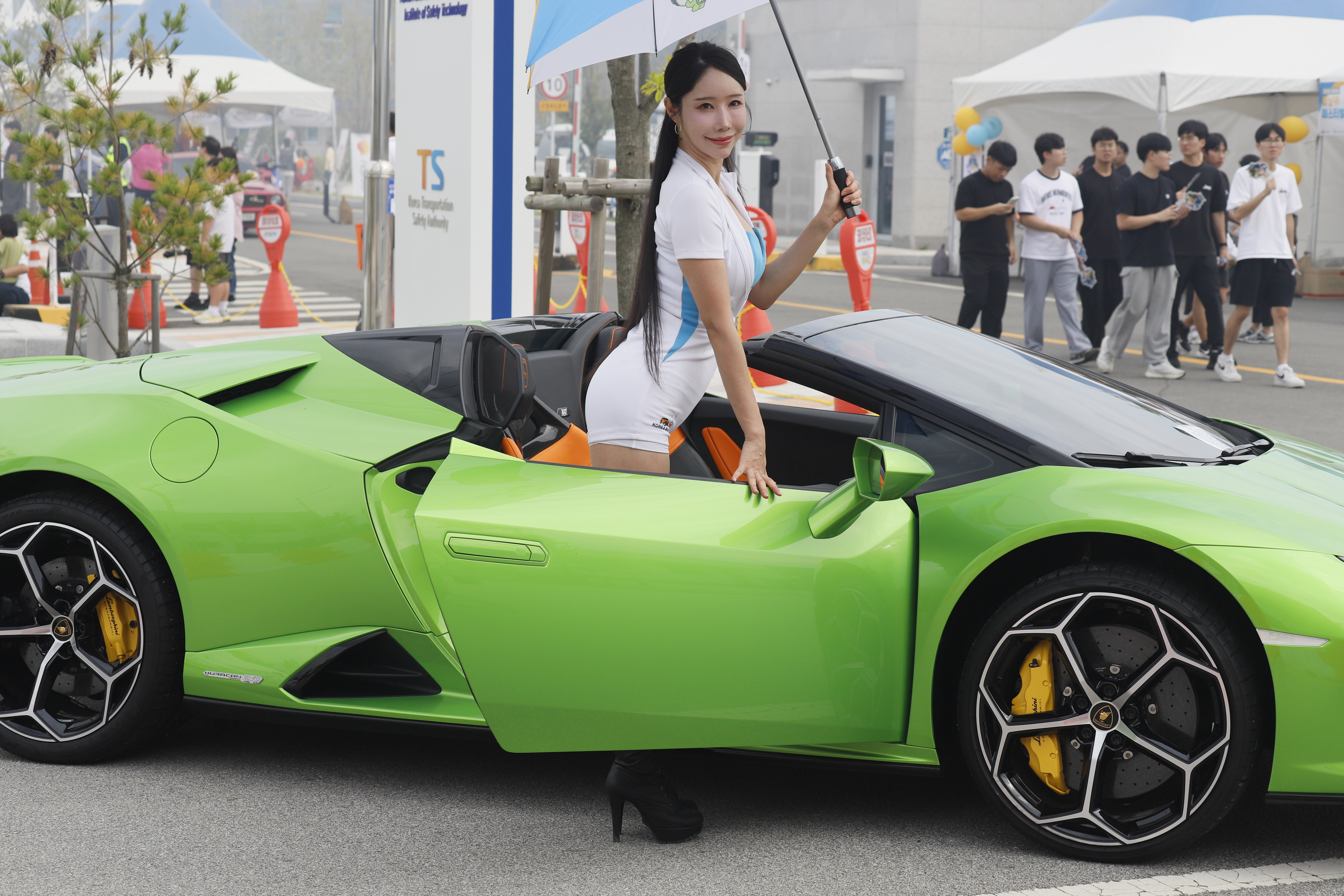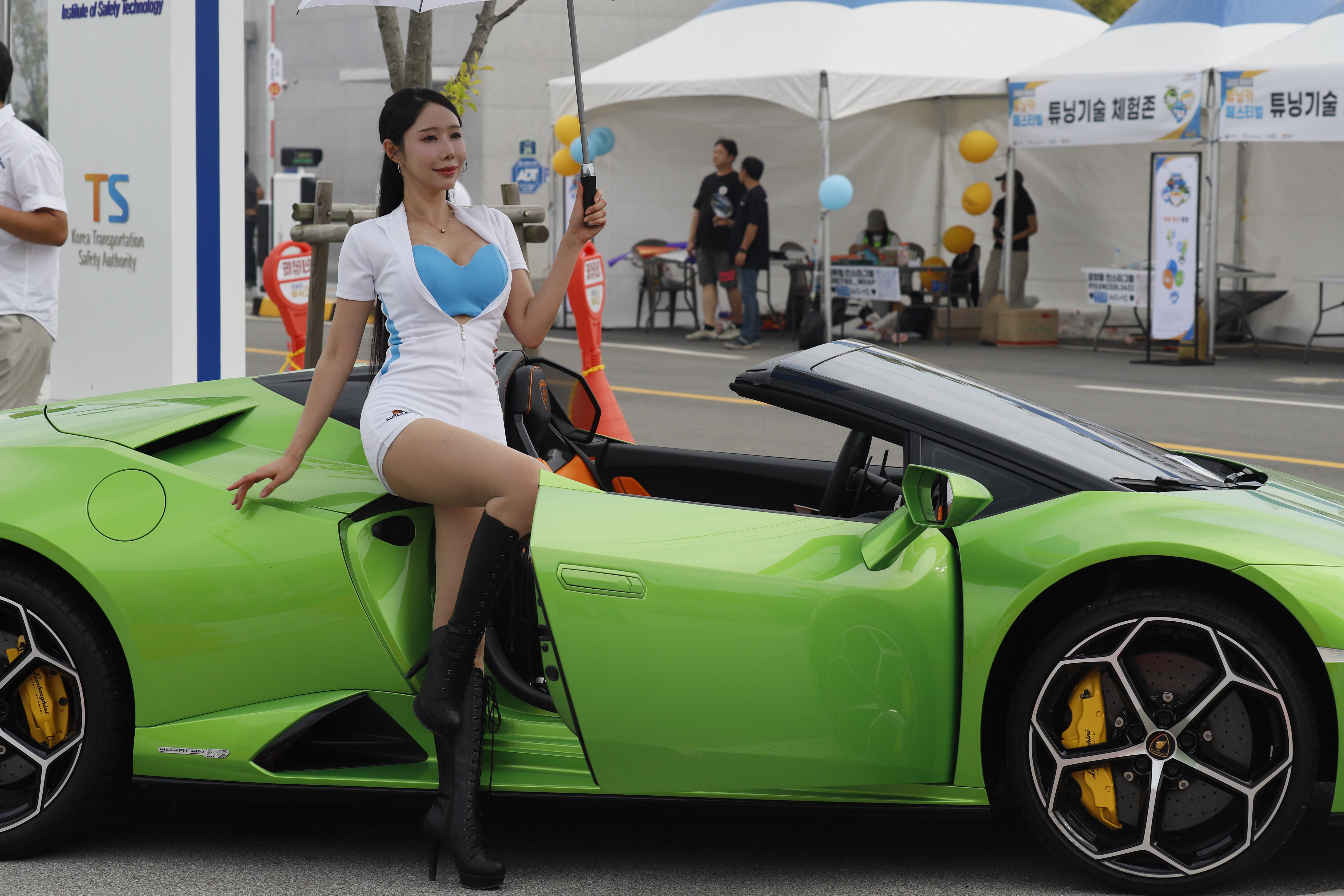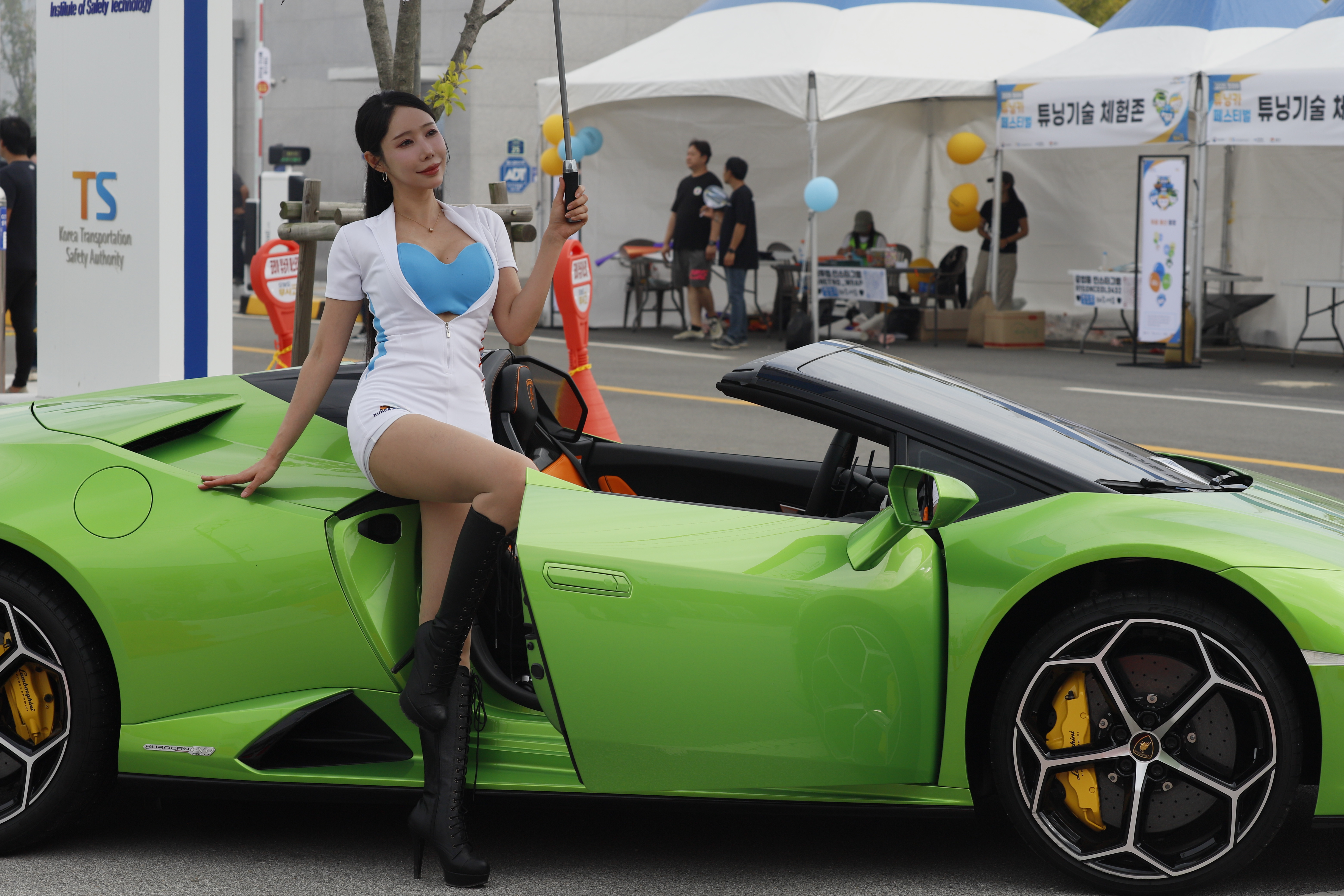 연두색 튜닝카 문을 연 상태에서 포즈 취합니다.