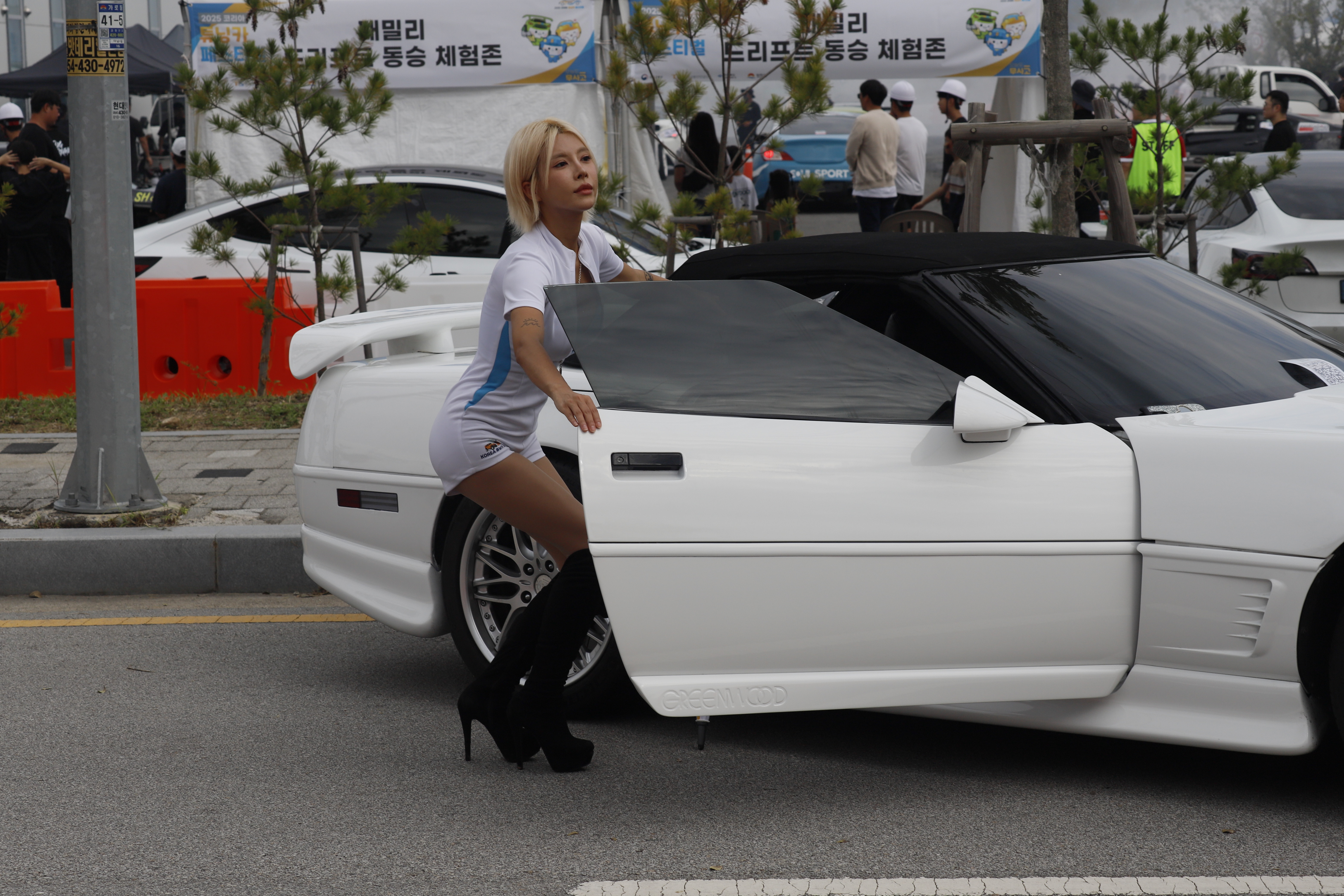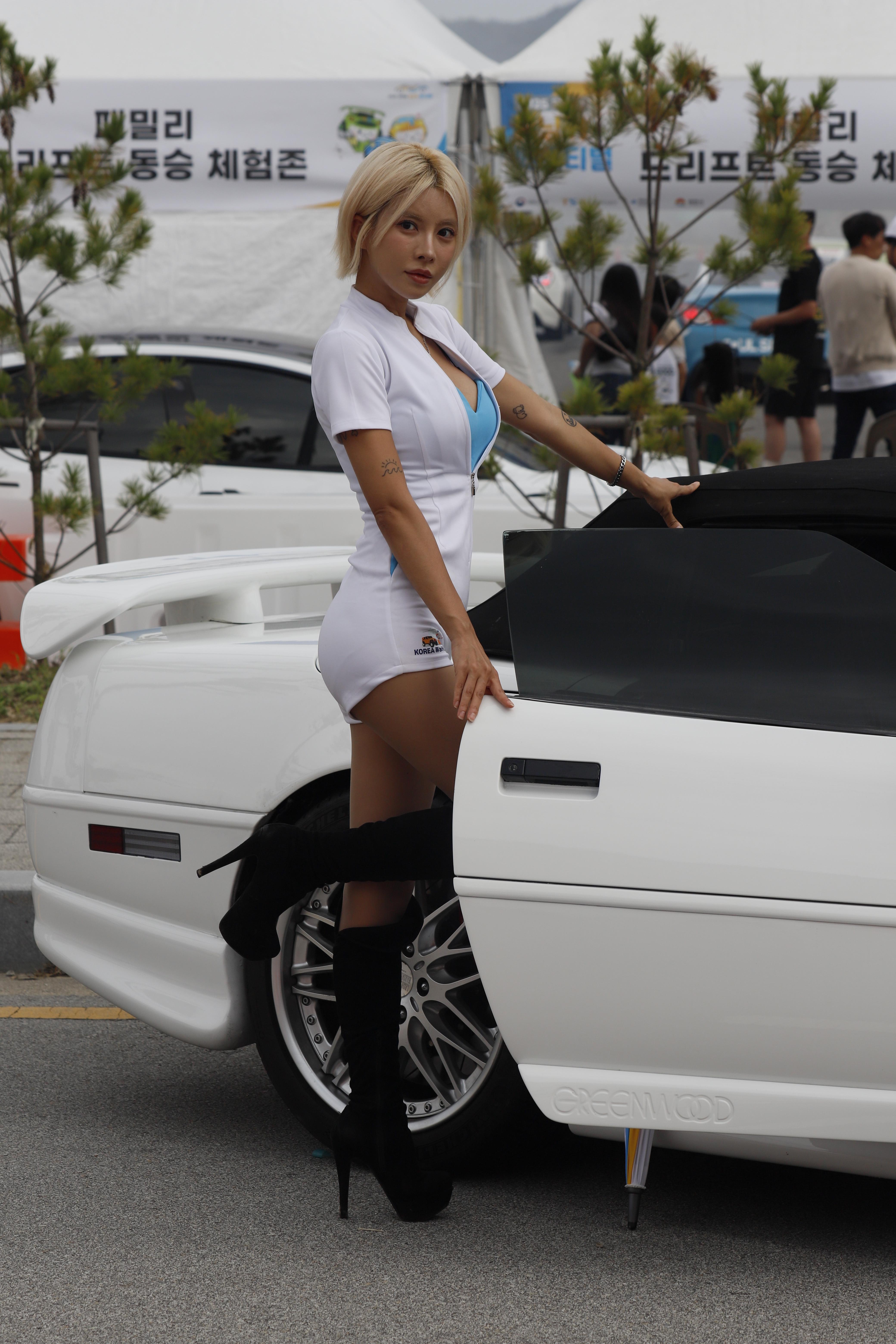 하얀색 스포츠카에서도 포즈 취합니다.
