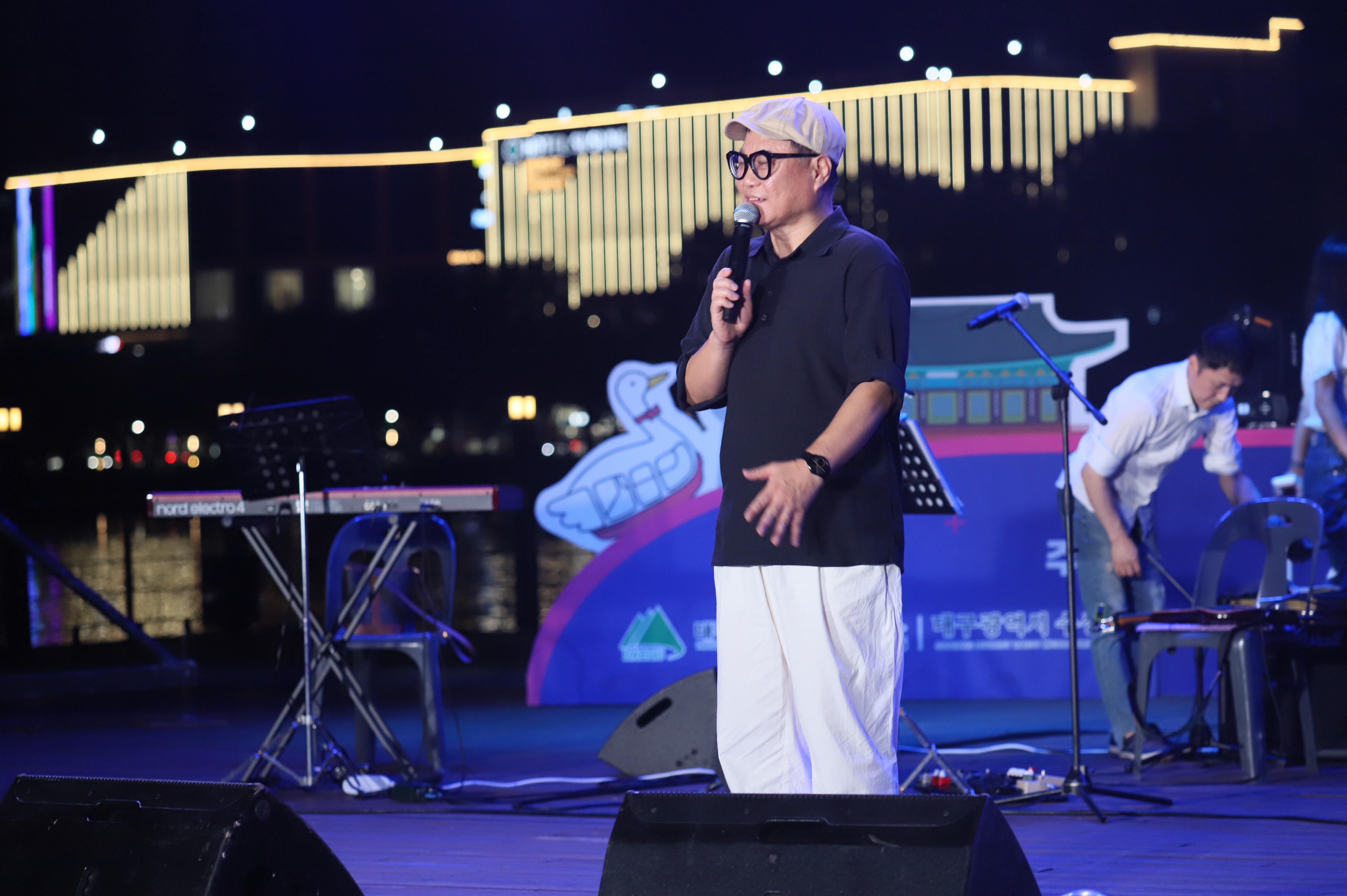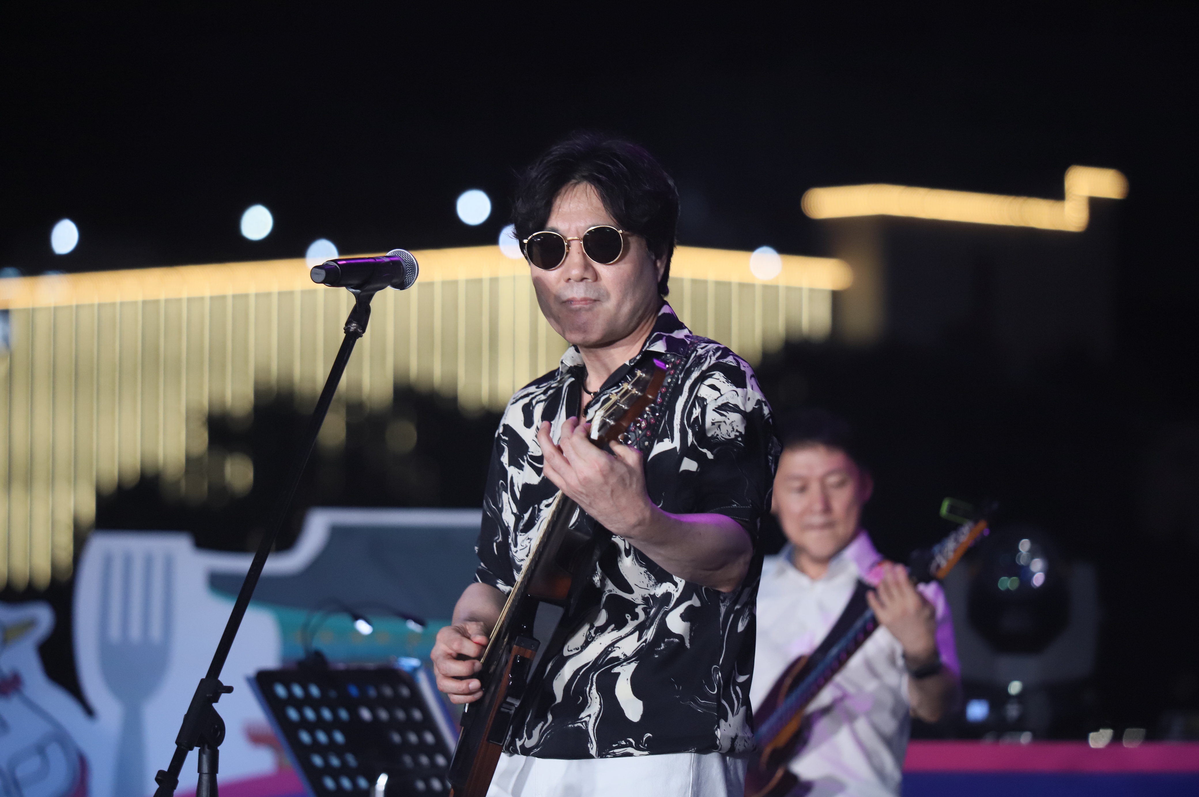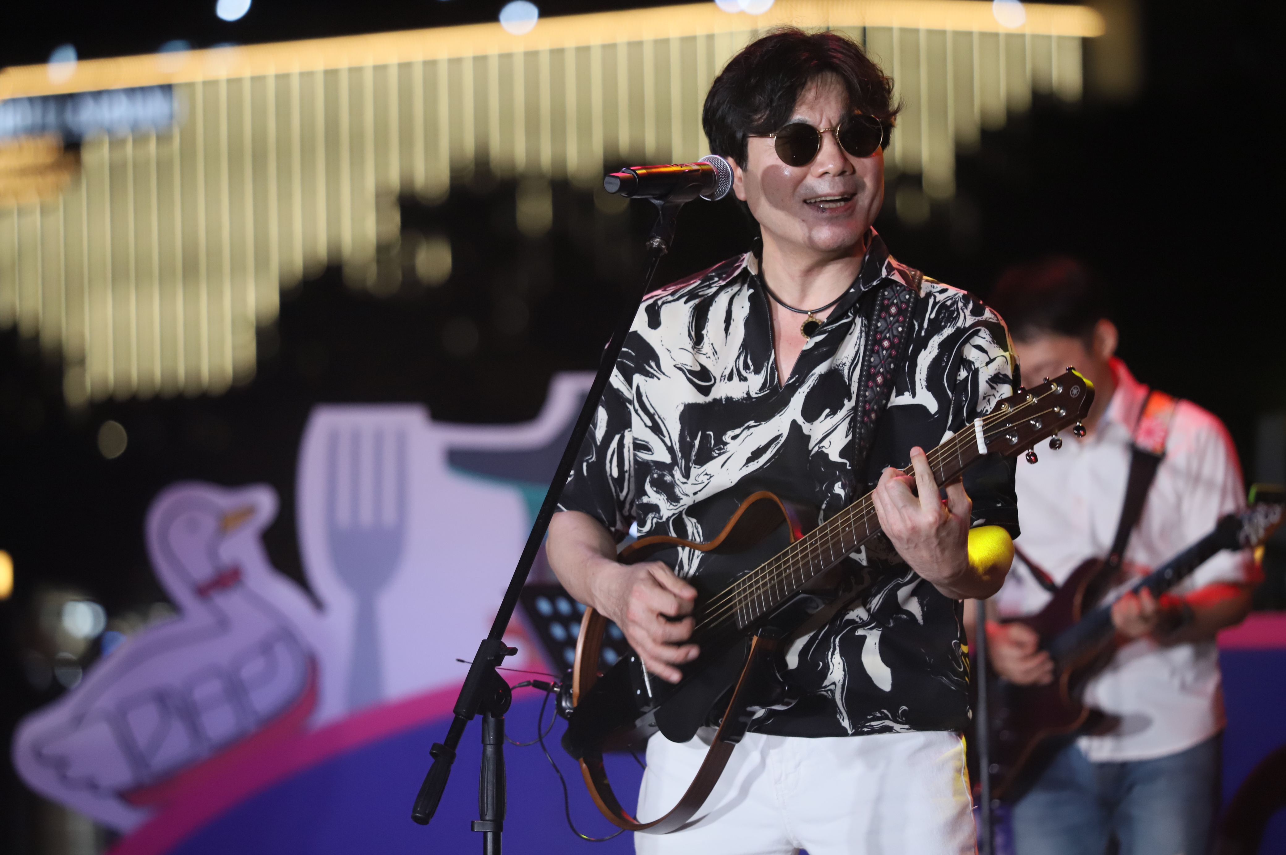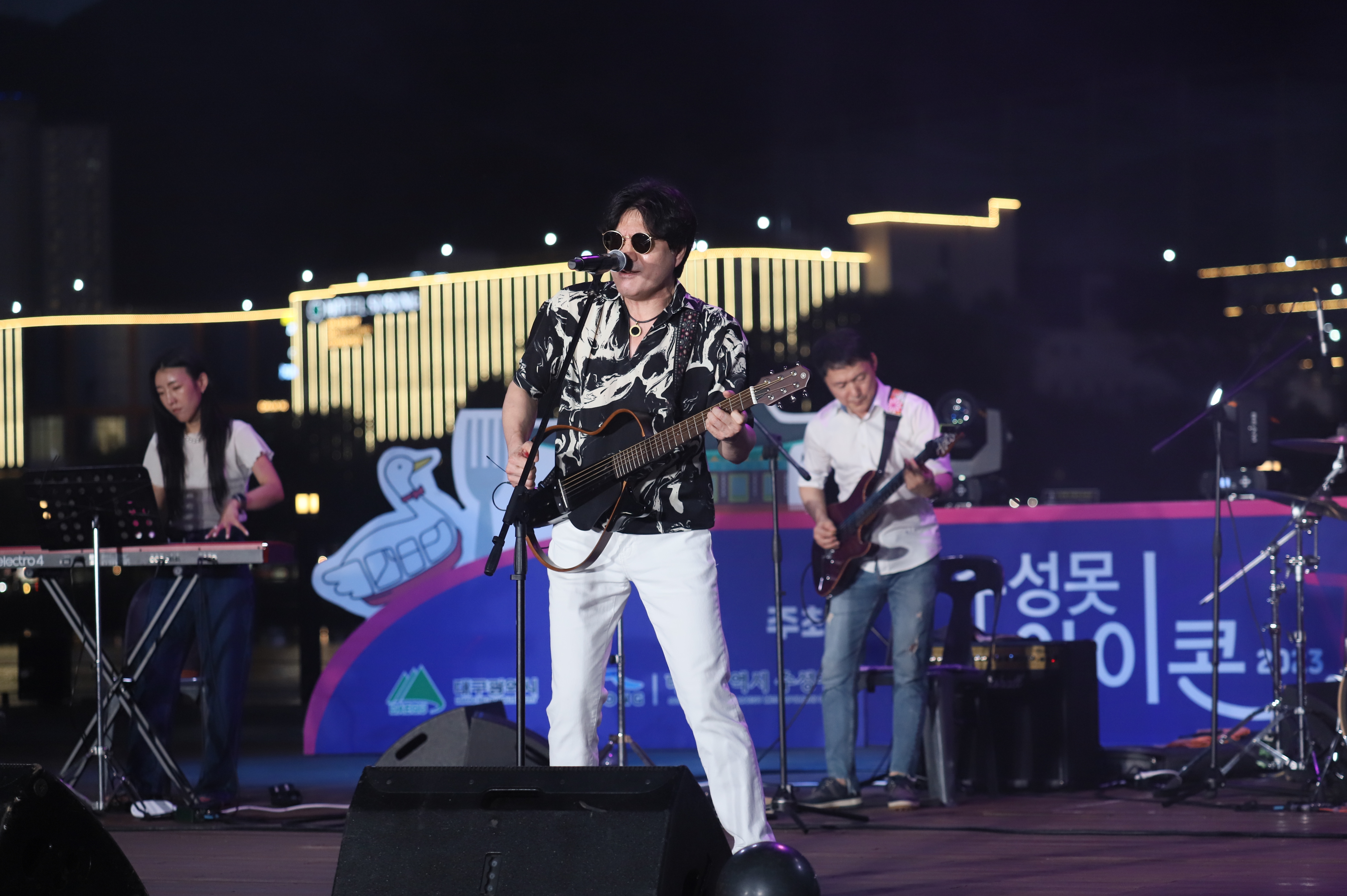 장진철 통기타 가수님은 선글라스를 쓰고 노래를 부릅니다.