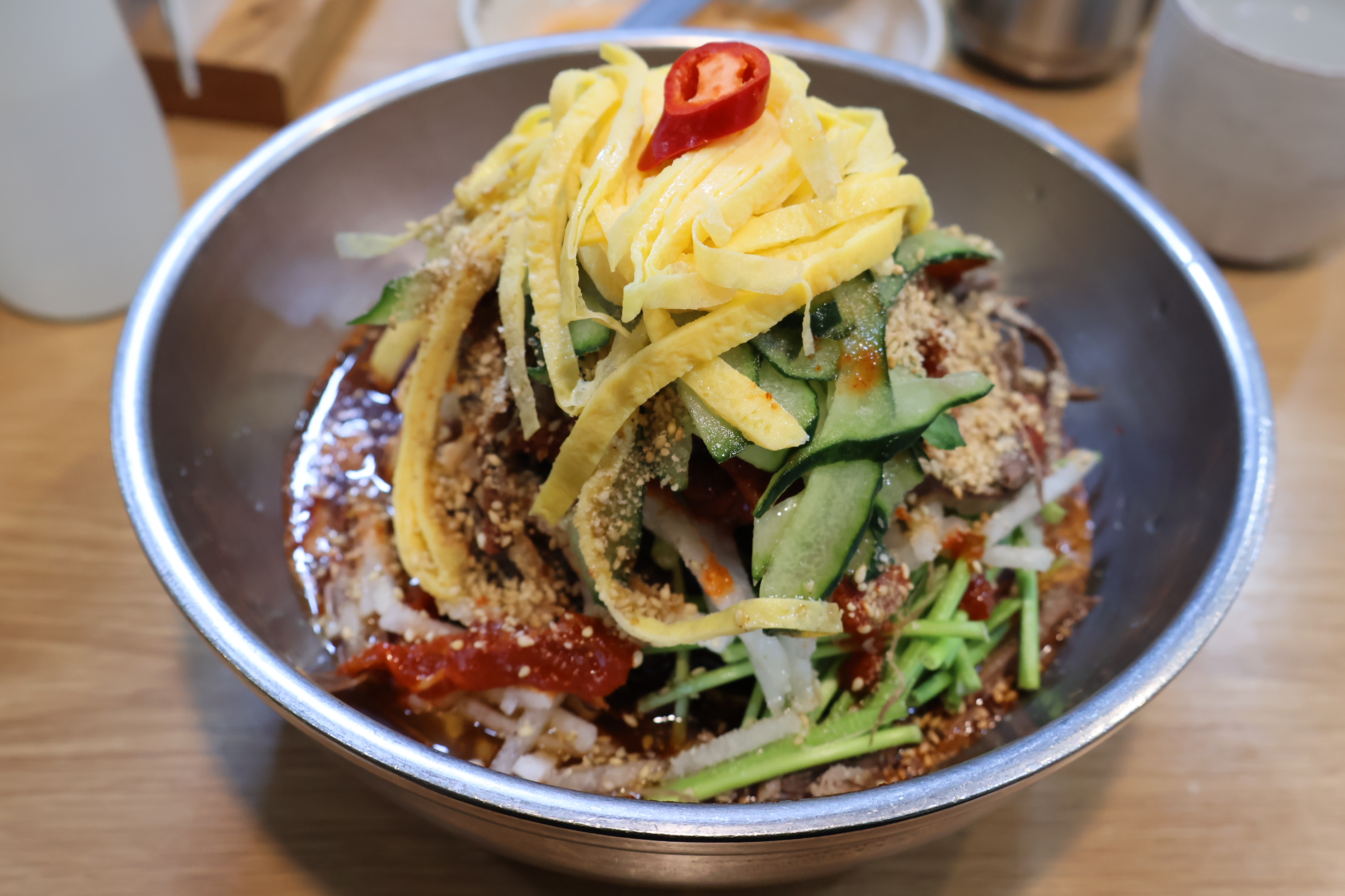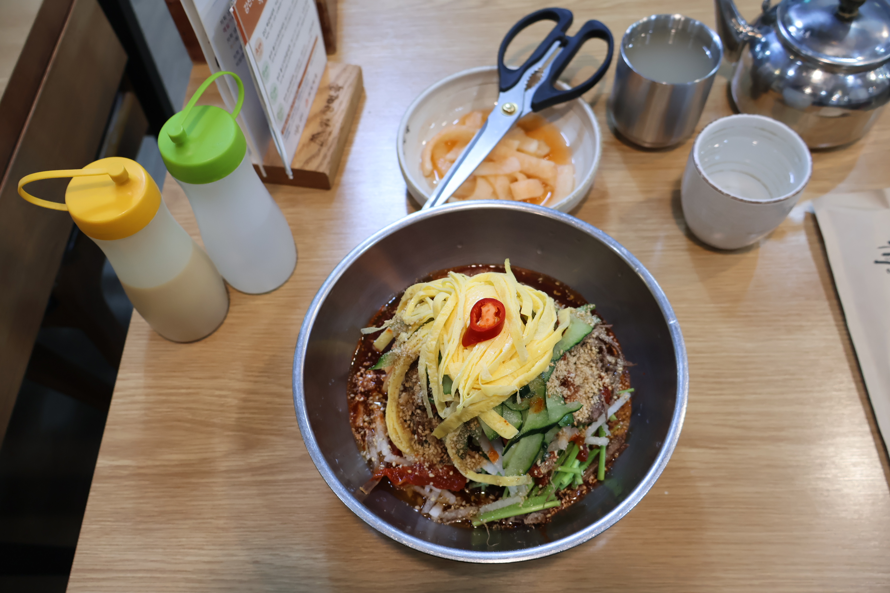 겨울 비빔냉면 보통 1만5천원입니다. 기존 비빔냉면은 1만2천원 이죠! 회냉면이 1만4천원 이면 쇠고기 육회가 들어 가지만 겨울비빔냉면은 달걀지단,미나리,황태,쇠고기육회가 들어가고, 무생채,오이,볶은고기가 들어가면 맛있습니다. 채소가 몸에 좋은 음식 입니다. 곱배기 주문하면 2천원추가, 사리 주문하면 4천원 추가 됩니다. 많이 오시기 바랍니다.