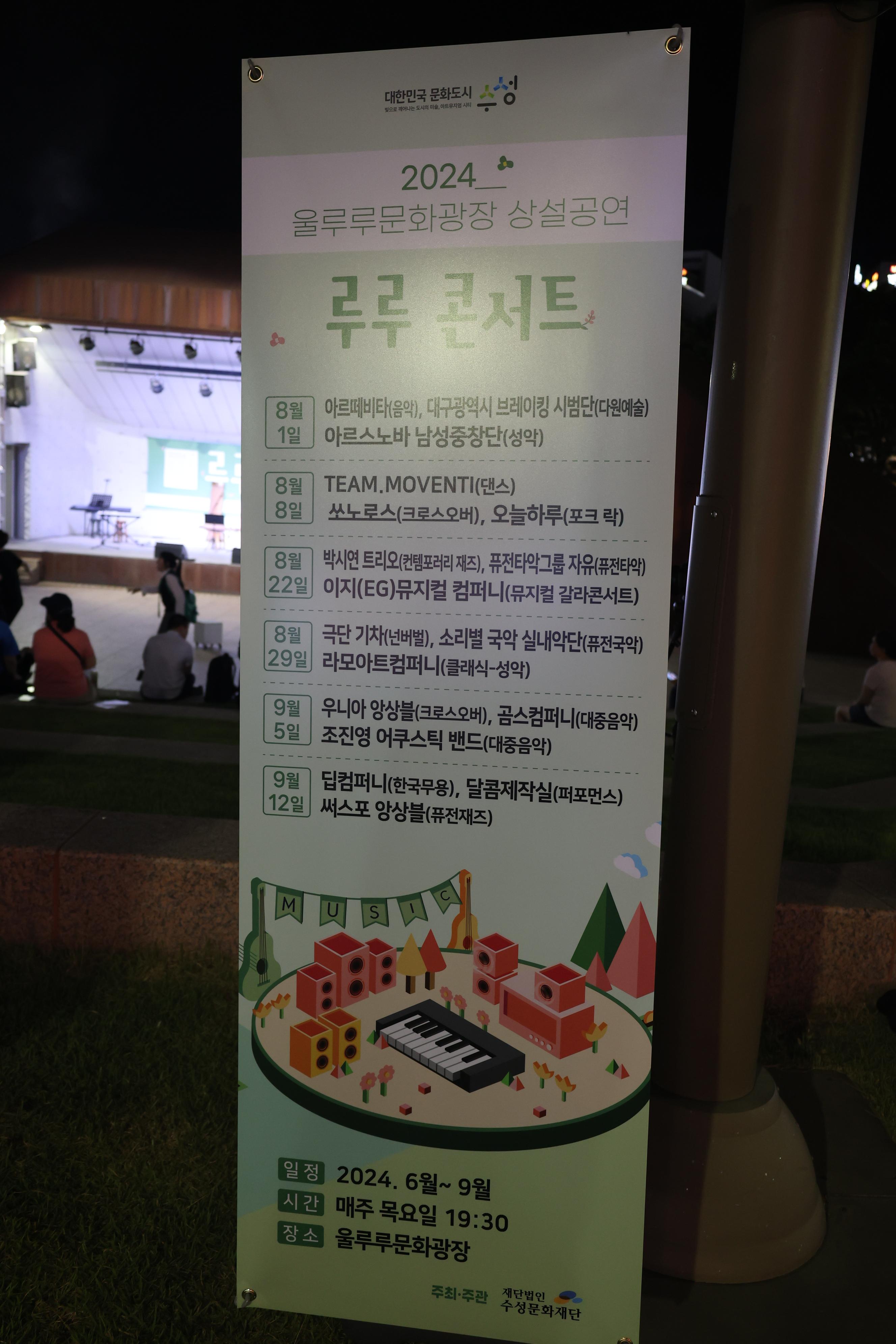 루루콘서트는 2024년 6월 중순부터 9월중순까지 3개월 동안 매주 목요일 자녁 19시30분 장소는 울루루문화광장에서 합니다.