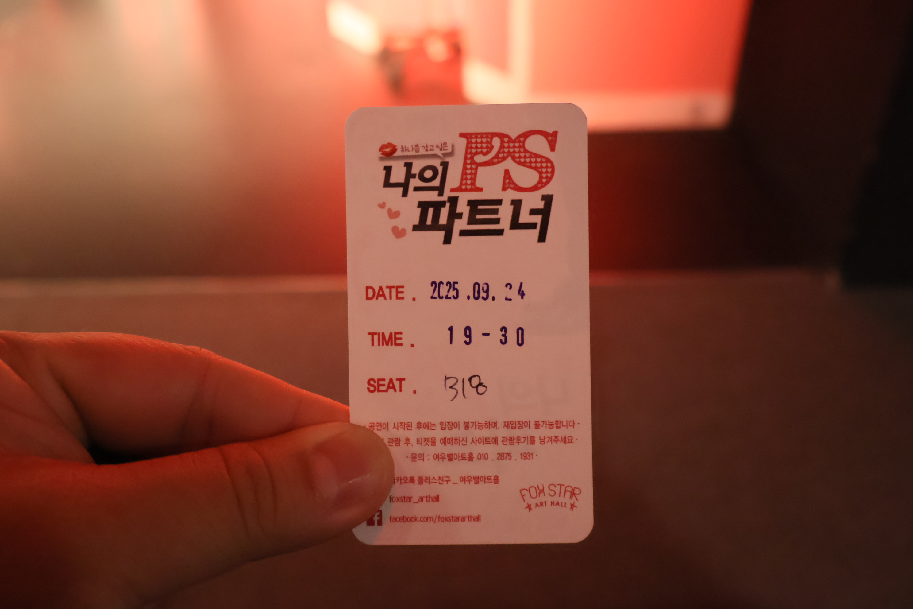 입장권 입니다.현승씨의 기타소리가 들렸습니다.배우들의 첫번째 입니다.이혜인 배우님 입니다.김준혜,이혜인,하정윤 배우님 입니다.김준혜,노영준,하정윤 배우님 입니다.두번재 포즈 취합니다.세번째 포즈 취합니다.포즈 취하고, 무대인사와 커튼콜을 하였습니다.배우랑 관객같이 포토타임을 하였습니다.배우들의 마무리 포즈 취하였습니다.출연자는 김현승역 김준혜, 이윤정역 하정윤, 강승준 겸 멀티역 노영준, 이소연 겸 멀티역 이혜인, 연출은 정세혁, 프로듀서 조성준 입니다.러닝타임은 90분 입니다.여우별아트홀에서 하였습니다.지하철 1호선 중앙로역 12분거리 또는 1,2호선 반월당역 도보 10분거리에 나옵니다.